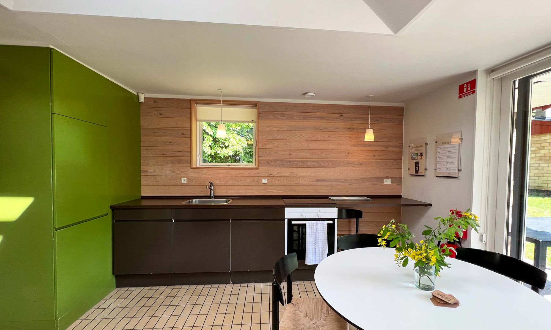 Køkkenet er veludstyret med blandt andet køleskab, komfur, opvaskemaskine, ovn og kaffemaskine. Der er en spiseplads til seks personer.